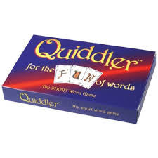 Quiddler is a fast paced game of words. Arrange your hand into words by taking turns drawing and discarding. Use your high point letters but don't get caught with them uncombined. High score wins. Short words can help you win too because a bonus is given for the most words as well as one for the longest word.